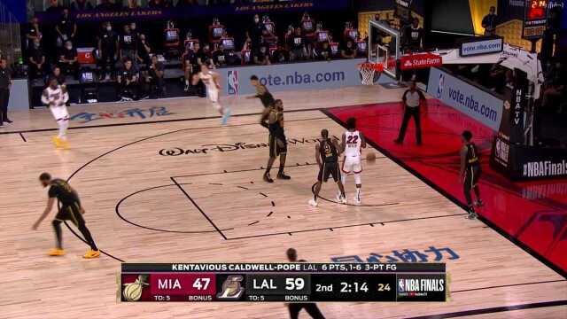 湖人领先热火的分差不断扩大,一度来到17分。半场结束时,湖人68-54领先热火。